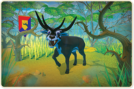 DarkHorn has a deep, charcoal black body with a massive twisted horn that seems to absorb light. His eyes glow faintly purple in the dark.